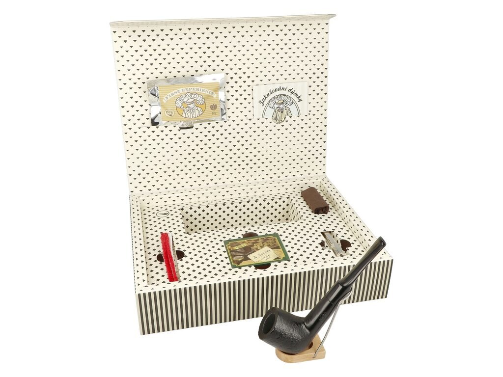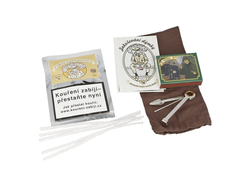 Obsah sady: dýmka, dýmkový tabák BPK First Experience (10 g), dýmkové dusátko a zápalky, čističe dýmky, látkový sáček na dýmku, návod pro zakuřování dýmky. (Barva čističů se může lišit od té, která je zobrazena na obrázku.)