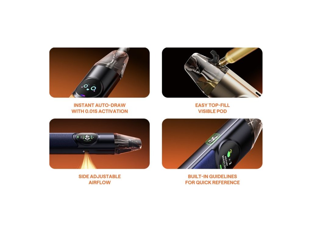 Součástí zařízení je velkokapacitní 4ml cartridge, která umožňuje více než 15 naplnění a disponuje 5vrstvou ochranou proti úniku, což zaručuje spolehlivý a čistý provoz. Přehledný 0,85" barevný displej poskytuje snadný přístup ke všem nastavením zařízení a zobrazuje důležité informace. Integrovaná 1500mAh baterie s rychlým nabíjením 5V/2A zajišťuje dlouhou výdrž a rychlé doplnění energie. Kromě toho zařízení umožňuje nastavení výkonu v rozmezí 5–40 W, díky čemuž si každý uživatel může přizpůsobit zážitek z vapování podle svých preferencí.