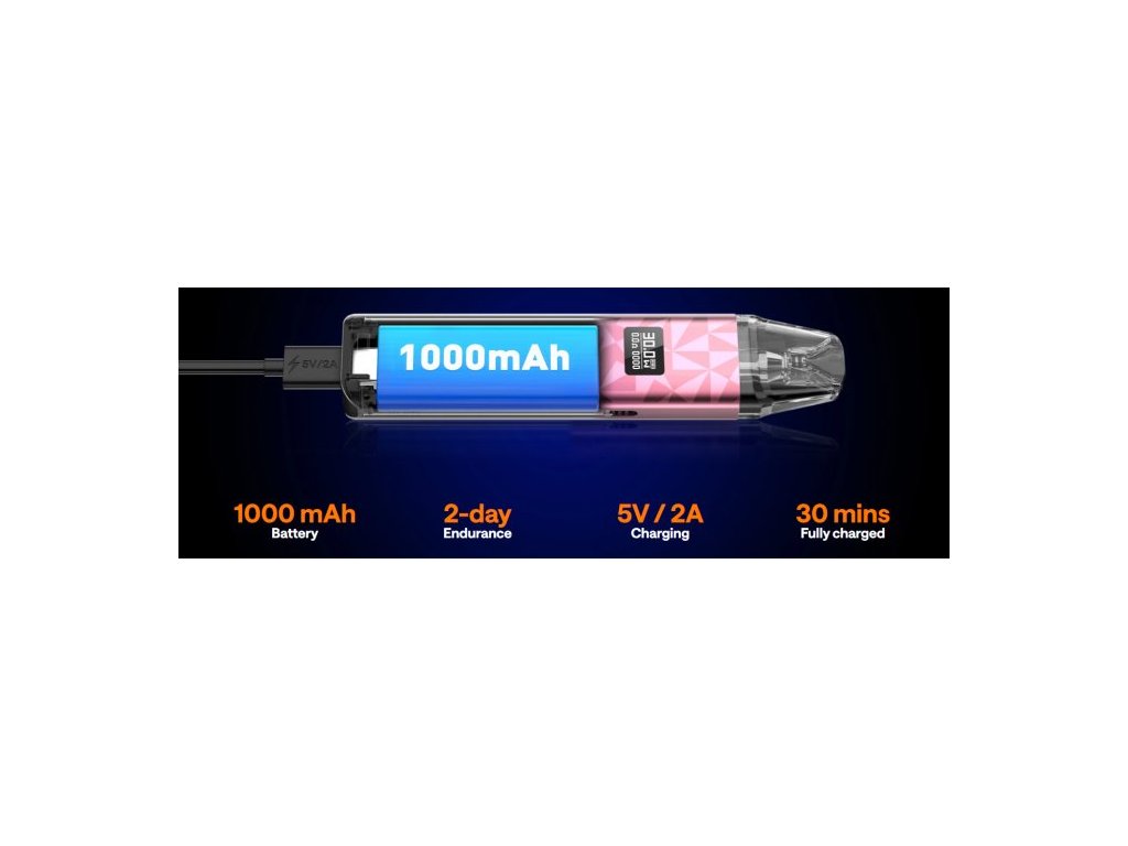 Populární POD systém OXVA Xlim představuje řadu Classic Edition, která vychází z první veleúspěšné řady těchto e-cigaret, avšak nese s sebou prvky nejmodernějšího zařízení. Ergonomické tělo baterie z hliníkové slitiny disponuje integrovaným monočlánkem o kapacitě 1000mAh, který s přehledem vydrží běžnému vaperovi po celý den. O super rychlé nabití se postará USB-C port (5V/2A) umístěný na spodní straně zařízení. Postranní airflow je regulován pomocí speciální páčky, která vám umožní si vzduch nastavit přesně podle vaší chuti. Xlim zároveň disponuje regulovatelným výkonem 5-30W, který můžete sledovat na OLED displeji na přední části zařízení. Pod displejem se nachází ovládací tlačítko, které můžete použít pro sepnutí, nebo využít funkci automatického potahu. V obsahu balení najdete cartridge Xlim V3 s horním plněním - není potřeba vyndavat cartridge z těla baterie při plnění liquidem.
