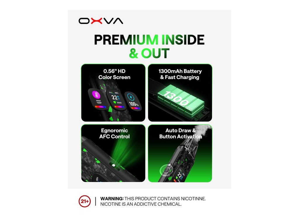 Prémiový pod systém OXVA XLIM PRO 2 DNA je postavený na pokročilém čipu EVOLV DNA, který je v komunitě pokročilých vaperů považován za technologický standard v oblasti přesnosti, bezpečnosti a uživatelské kontroly. Tento čip je vybaven technologií Replay, která umožňuje „zapamatovat si“ ideální potah a následně ho přesně opakovat – čímž zajišťuje konzistentní chuť při každém použití. Zároveň obsahuje systém ochrany proti dry hitu – čip analyzuje stav spirálky až 30 000 krát za sekundu a včas upraví výkon tak, aby nedošlo k připálení vaty ani při nízké hladině e-liquidu. Výsledkem je nejen lepší chuťový zážitek, ale i delší životnost cartridge. Tělo zařízení z luxusního kovaného karbonu a zinkové slitiny nejen skvěle vypadá, ale také vydrží každodenní používání. Baterie s kapacitou 1300mAh podporuje výstupní výkon až 30W a ve spojení s rychlým nabíjením přes USB‑C (5V/2A) je ideální pro celodenní provoz bez zbytečných prostojů. Vapování je maximálně přizpůsobitelné – zařízení nabízí automatické i tlačítkové spouštění, boční regulaci airflow a k tomu 0,56″ barevný displej, na kterém máš všechny údaje přehledně zobrazené. Pokročilejší uživatelé navíc ocení možnost plného přizpůsobení výkonových křivek a parametrů přes Evolv Escribe software na PC.